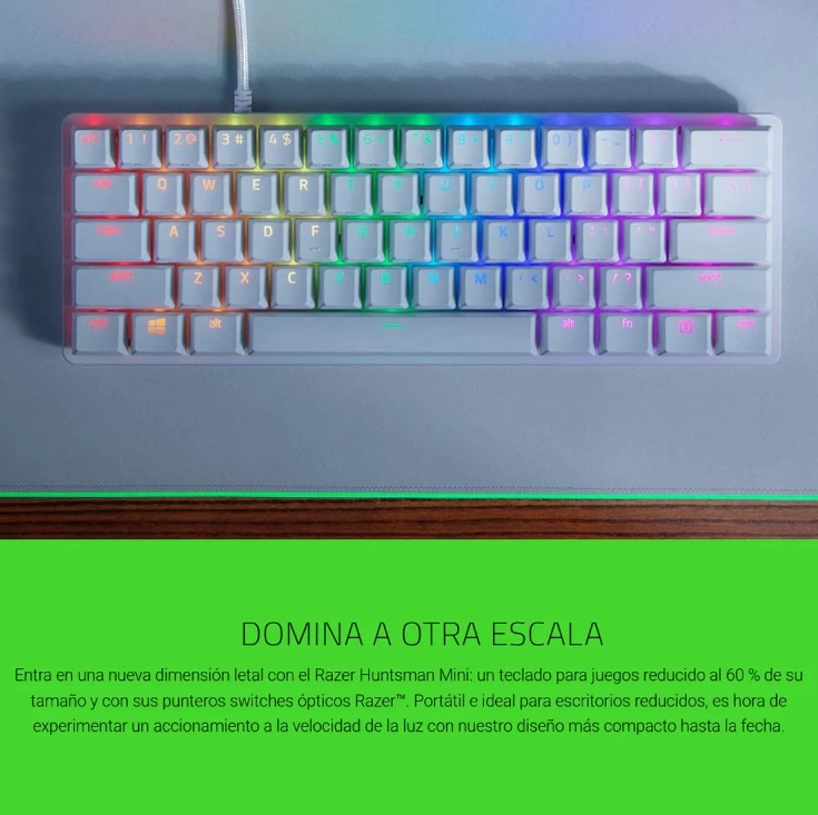 Descubre el TECLADO RAZER HUNTSMAN MINI MERCURY, diseñado para gamers que buscan rapidez y eficiencia en cada pulsación. Su diseño compacto 60% libera espacio en tu escritorio, ideal para sesiones de juego intensas o trabajos que requieren movilidad.